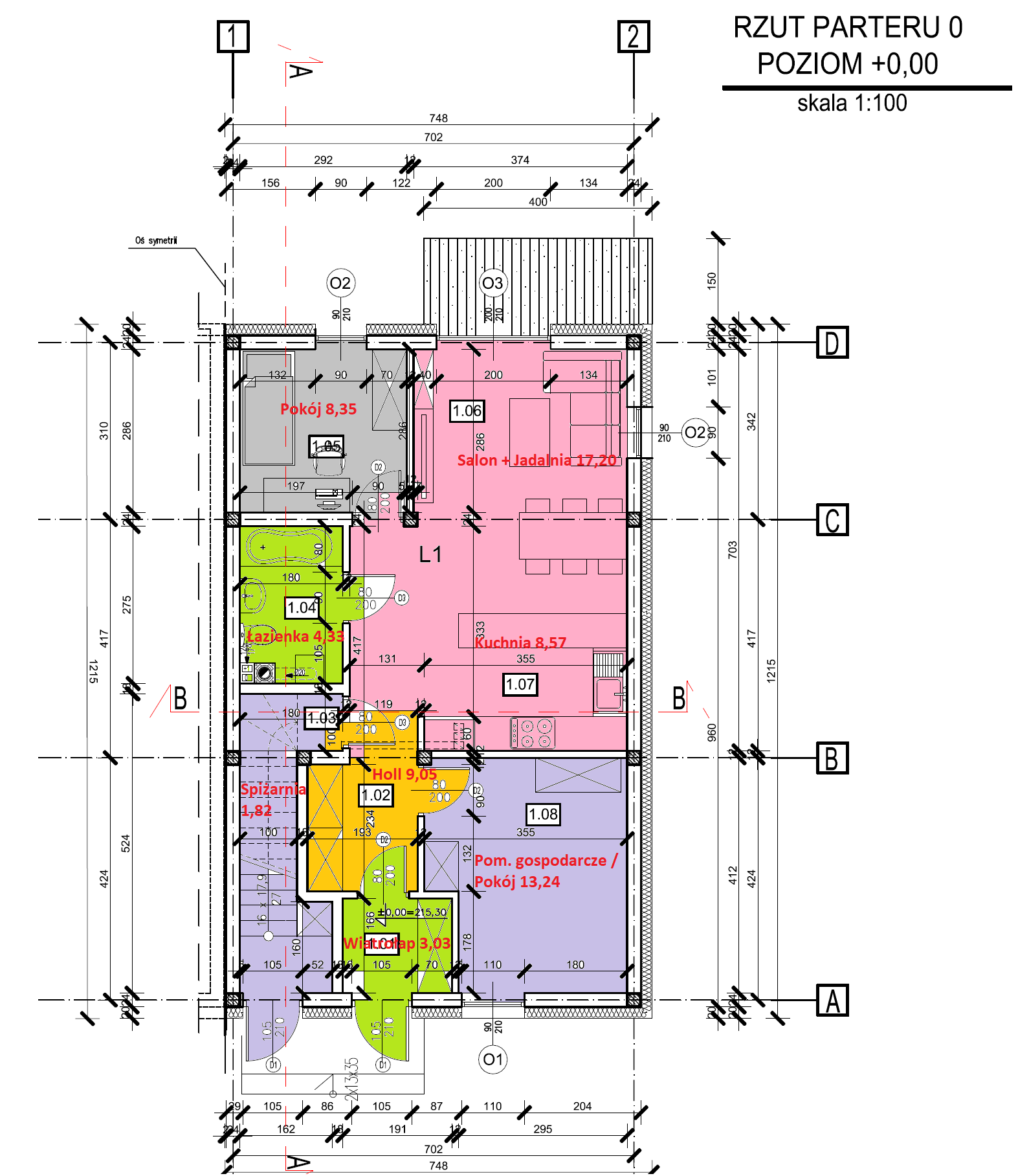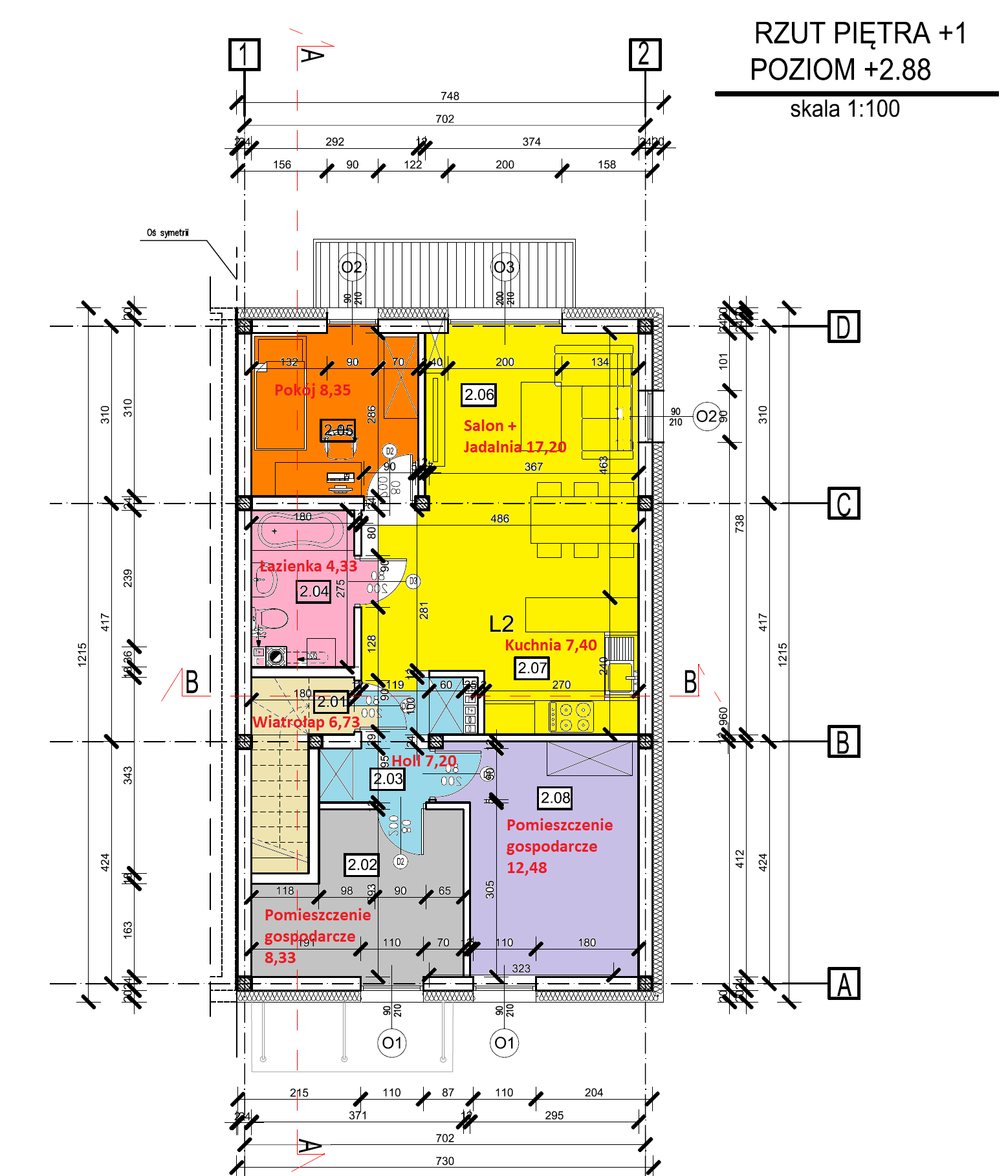 Piętro ma powierzchnię 72,02 m2. Mieszkanie posiada wiatrołap z klatką schodową trzy niezależne pokoje, łazienkę oraz połączone: kuchnię, salon i jadalnię, które stanowią idealną przestrzeń do życia całej rodziny.